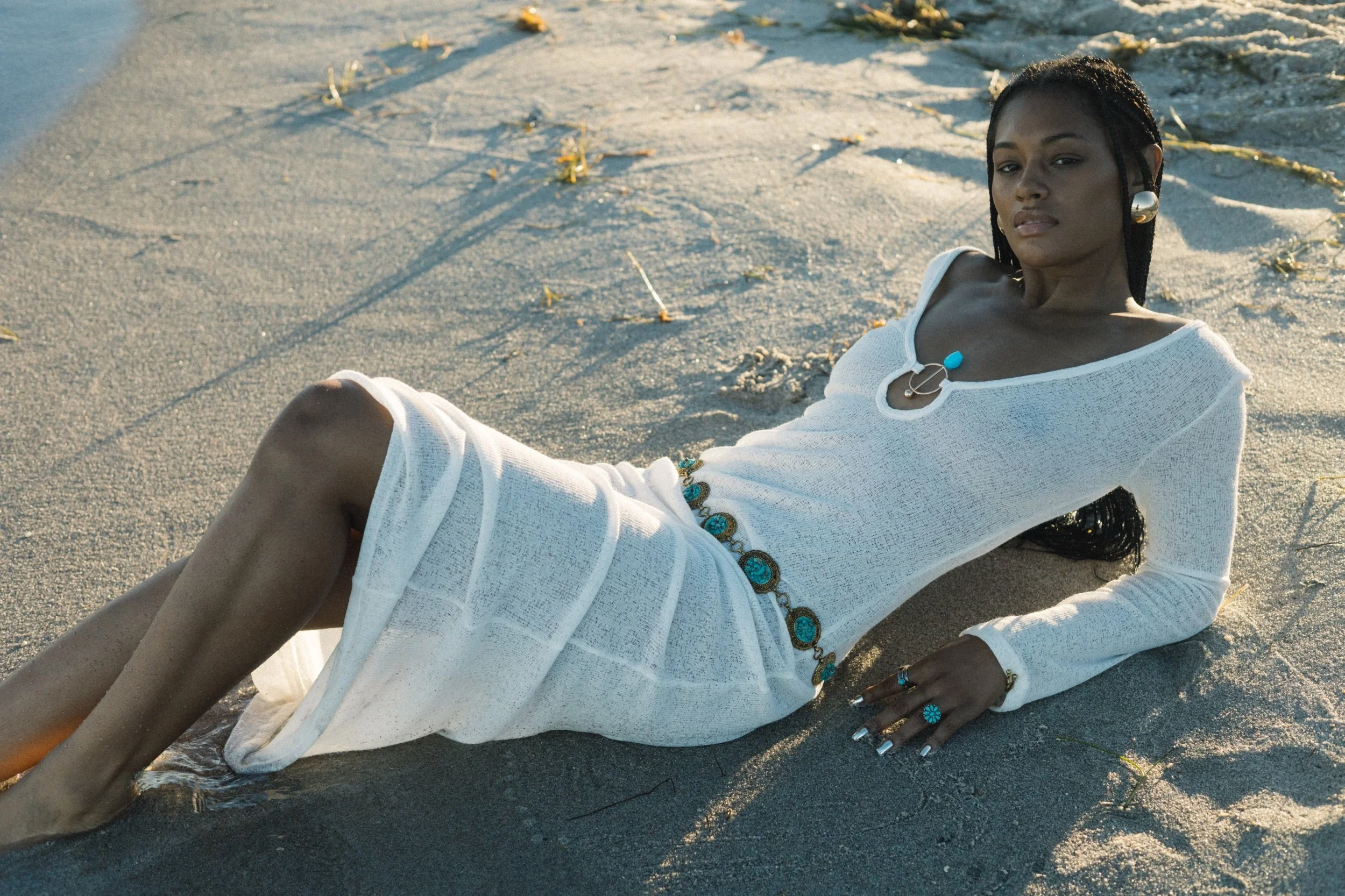 Embrace understated glamour in the Drape Knit Coverup. Crafted from a lightweight stretch-knit, this maxi-length silhouette features a deep plunging neckline with a metallic ring detail and an open back that adds just the right amount of allure. The long sleeves and body-skimming fit offer balance and elegance, perfect for layering over swimwear or transitioning into sunset dinners. Pair it with your favorite belt or gold accents to elevate the look.